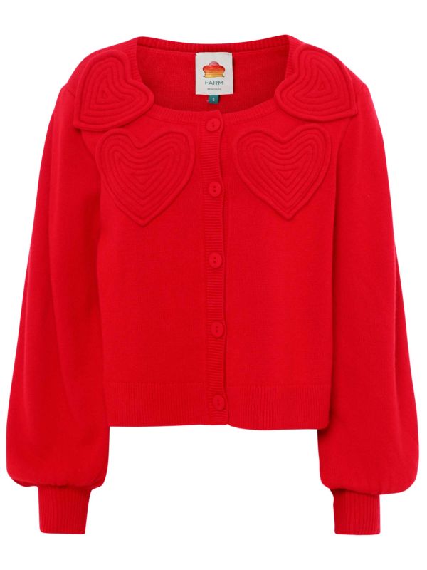 The Heartful Knit Cardigan is a button-front design from FARM Rio. It features oversized heart appliqués across the neckline for tactile, decorative interest. The piece has a round neck, ribbed hem and cuffs, and voluminous long sleeves that gather into fitted ribs for definition. Fastened with tonal buttons down the front, it layers neatly over shirts or dresses and lifts proportions when worn with high-waisted bottoms. The knit construction provides comfortable stretch and a structured finish.