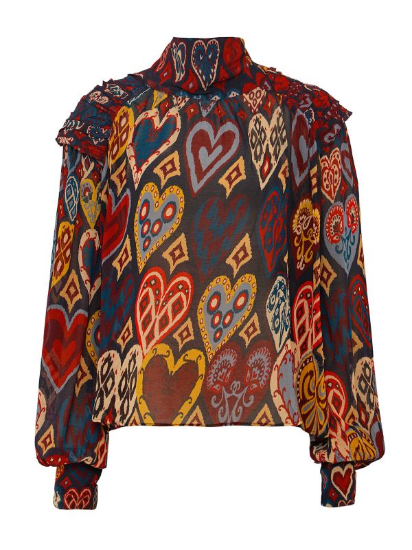 Add a touch of whimsy to your looks with Farm Rio's Hearts Ikat blouse. This Farm Rio blouse is a flowy style made from a breezy fabric. It has balloon sleeves and a high neckline with ties at the back that drape over the cut-out back detail. Bursting with colour from the repeated hearts ikat pattern, this piece is a statement style for wearing every season.