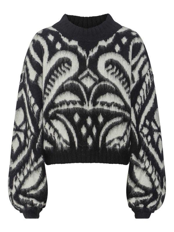 Elevate your wardrobe with the Farm Rio Ikat pineapple jumper, a chic and playful piece that effortlessly blends comfort with style. Crafted from a cosy wool blend, this jumper features a flattering high neckline and long, voluminous sleeves that add a touch of drama.