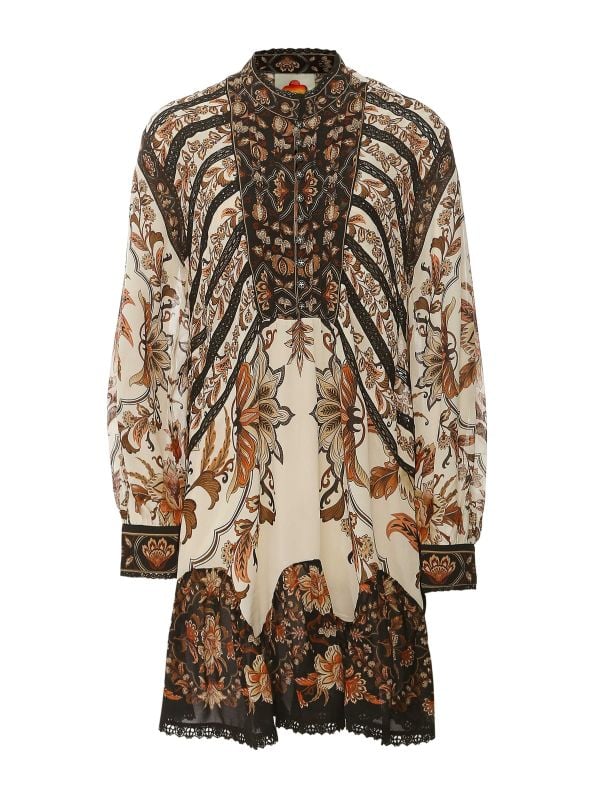 FARM Rio Majestic Garden Lace Mini Dress is a floaty mini with a high band collar and a decorative front placket with loop fastenings and covered buttons. The design features a gathered yoke and long balloon sleeves with buttoned cuffs, while vertical trimmed panels shape the silhouette. A scalloped, tiered hem finished with lace edging adds movement and texture, and the relaxed fit sits above the knee. Pair with boots for daytime ease or dress with heels for evening plans.