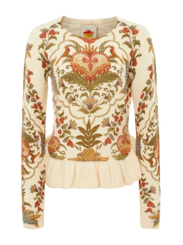 The Majestic Hearts Jumper showcases an ornate jacquard heart-and-floral motif worked across the body and sleeves. It features a crew neckline, long sleeves and a peplum ruffle at the hem that adds subtle shape. The fitted silhouette sits at the hip, making it simple to wear with high-waisted denim or a skirt for daytime dressing. Designed by FARM Rio, this graphic knit brings decorative detail to everyday outfits.