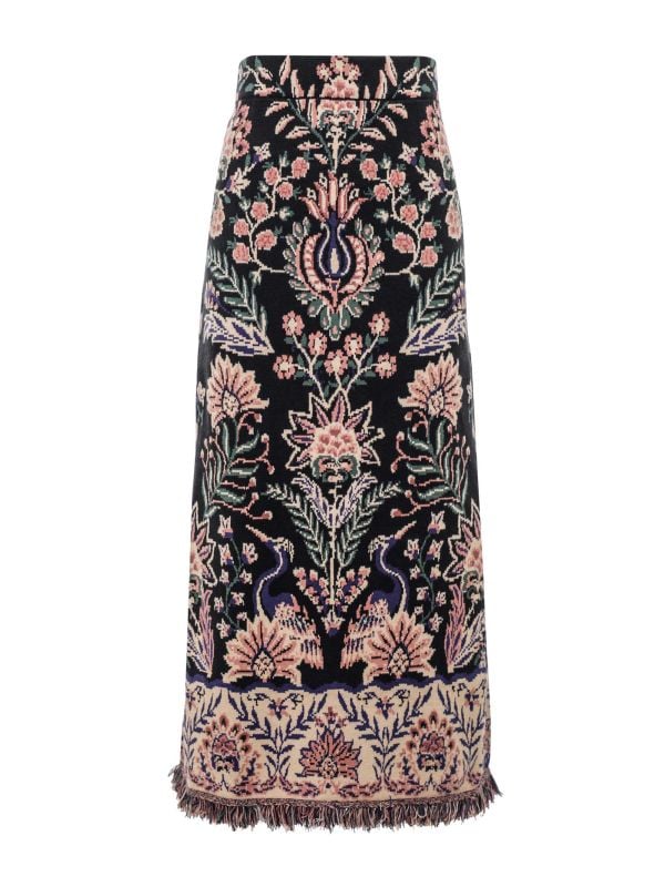 FARM Rio's Marvellous Garden Midi Skirt is a midi-length jacquard knit showcasing an intricate floral motif. Cut in a straight silhouette with a neat waistband, it falls to a fringed hem that adds movement to the design. The knit construction offers structure with a soft drape. Layer under a tailored coat for cooler days or style with sandals in warmer months; the skirt balances statement patterning with a refined shape.