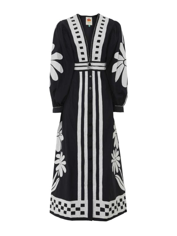 An occasion wear must-have, discover the Nature Buttoned Maxi Dress by Farm Rio. This enchanting piece is crafted from pure cotton and showcases a deep V neckline, voluminous sleeves, a cinched waist and loose-fit maxi skirt. Featuring large floral and geometric patterns in contrasting white, this Farm Rio maxi dress is a unique design perfect for special moments.