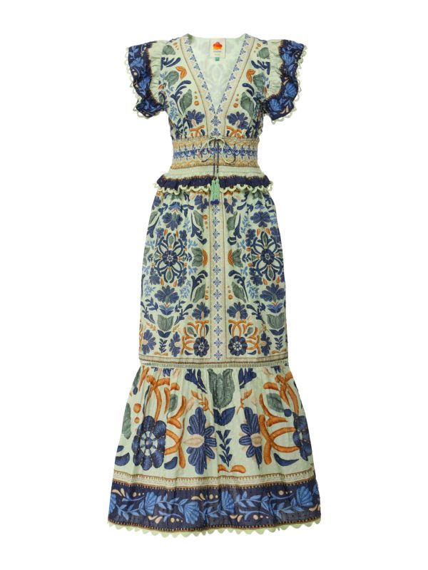 Inspired by the beauty of the ocean, the Ocean Tapestry maxi dress is another stunning design from Farm Rio. Featuring a detailed ocean-inspired tapestry, the dress has a flattering V neckline, short ruffle sleeves, an elasticated waistband with a self-tie bow detail, frills at the waist and a scallop hem. This dress is a unique style that will elevate your collection.