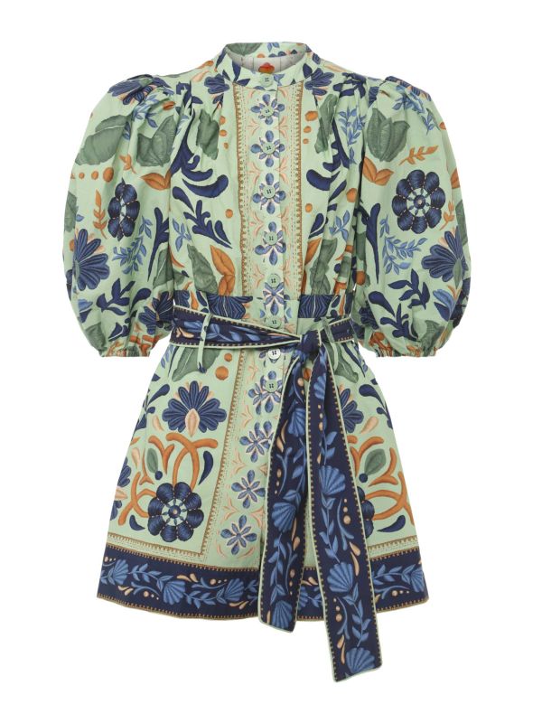 Bring bold colour to your wardrobe with the Ocean Tapestry romper from Farm Rio. Featuring an all-over ocean-inspired print, this playsuit is made from 100% cotton and has a high neckline, central button closure, elbow-length puff sleeves with elasticated endings and a self-tie belt at the waist with the matching ocean print. This practical playsuit also benefits from side seam pockets.