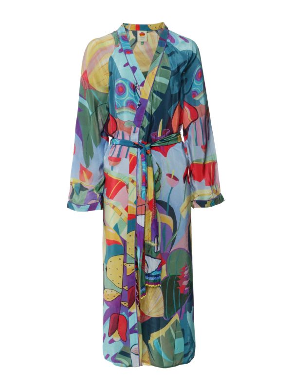 The Farm Rio Tropical Scenario kimono is made with summer in mind. This gorgeous kimono boasts a striking tropical print in multiple colours and features a deep V neckline, wrist-length sleeves, side pockets and a matching self-tie belt with bead details to the ends. With its lightweight and flowy silhouette, the kimono is ideal for styling over a dress or loose trousers in the sunshine.