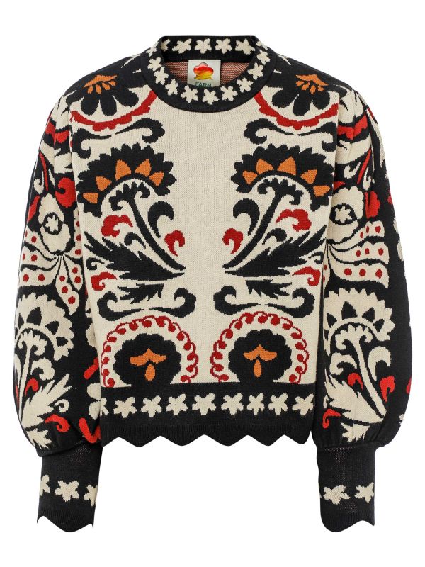 The FARM Rio Winter Tapestry Knit Jumper is a jacquard knit featuring an intricate tapestry motif across the body and sleeves. It is cut with a crew neckline and voluminous long sleeves that gather into fitted ribbed cuffs. Notable details include a scalloped hem and coordinated rib trim for a textured finish. This piece offers a bold layered look and pairs neatly with tailored trousers or a matching skirt for a cohesive ensemble.