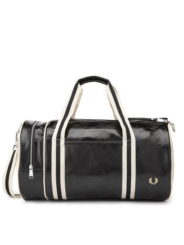 The Fred Perry barrel bag is a key piece in the British label's repertoire. Crafted in a faux leather with contrast tipped detail, the black bag exudes a sporty appearance. Featuring twin carry handles and an alternative webbing shoulder strap, whilst the double zippered interior offers ample space to store your essentials. The Fred Perry bag is finished with the label's logo for a signature touch.