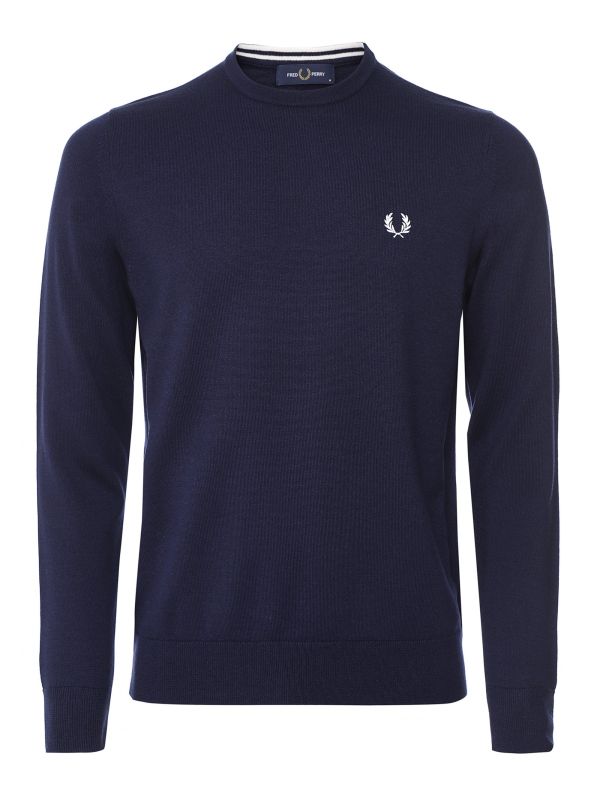 The Fred Perry Classic crew neck sweater is a superb choice for versatile winter layering. Engineered in a cotton and wool knit, the navy sweater ensures a soft handle and essential warmth, whilst the lightweight feel makes for easy styling with shirting and outerwear. Featuring a classic crew neck, ribbed trims and embroidered Laurel Wreath, with the inner collar twin-tipping adding sporty detail synonymous with the British label.