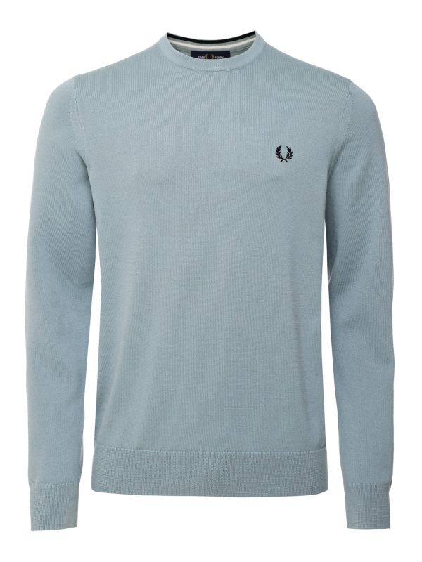 The Fred Perry crew neck sweater draws inspiration from classic sportswear. Engineered in a blend of cotton and ethically sourced merino wool, the sweater ensures a super soft and lightweight handle. Featuring a crew neckline and ribbed trims, whilst the silver blue hue is offset with the label's Laurel Wreath in black.