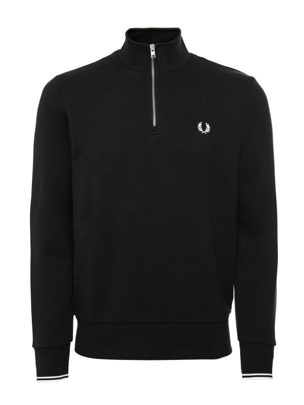 Embrace the sports-luxe trend with the Fred Perry half zip sweatshirt. Engineered in a cotton blend French terry, the sweat guarantees day-long comfort. Featuring a funnel neck with half zip fastening, ribbed trims and versatile black hue, whilst the embroidered Laurel Wreath and twin tipped cuffs add iconic detail.