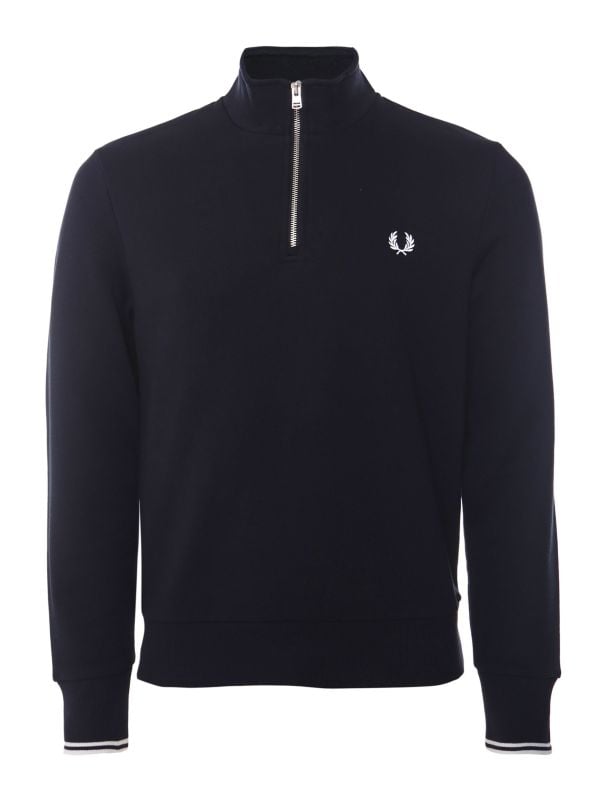 Embrace the sports-luxe trend with the Fred Perry half-zip sweatshirt. Engineered in a cotton blend French terry, the sweatshirt guarantees day-long comfort. Featuring a funnel neck with half zip fastening, ribbed trims and versatile navy hue, whilst the embroidered Laurel Wreath and twin tipped cuffs add iconic detail.