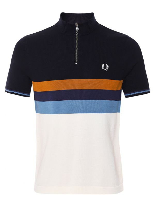 Drawing inspiration from the sport of cycling, the Fred Perry knitted funnel neck polo exudes sleek sporty style. Engineered in a fine knit gassed cotton, the polo offers a super soft handle. Featuring a funnel neck with zip placket, ribbed cuffs and embroidered Laurel Wreath, whilst the horizontal stripe pattern lends a bold contrast.