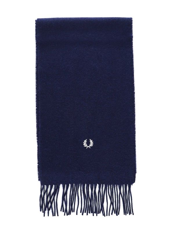 Embrace a classic British heritage style with the Fred Perry lambswool scarf. Lovingly knitted in Scotland from pure lambswool, the navy scarf offers a super soft handle and essential warmth. Featuring traditional tasseled edges and signature embroidered Laurel Wreath.