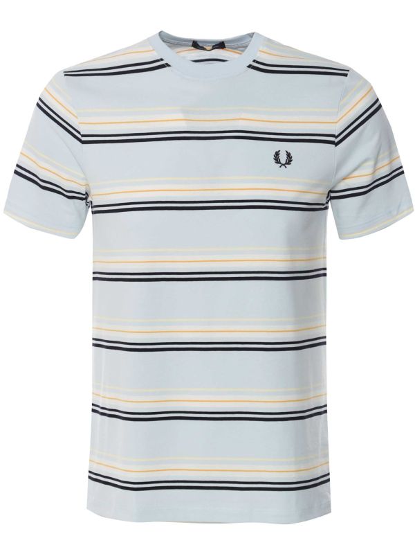The Fred Perry striped t-shirt is an ideal option for fresh summer style. Crafted from a soft cotton jersey in a light ice colour, the tee features a ribbed crew neck and short sleeves, with the stripe pattern lending a stylish aesthetic. The Fred Perry t-shirt is complete with an embroidered Laurel Wreath for an iconic finish.