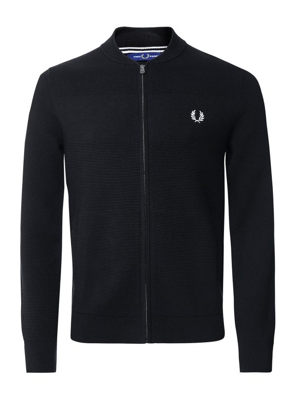 The Fred Perry bomber cardigan expertly fuses the comfort of knitwear with a classic bomber jacket silhouette. Engineered in a cotton rich knitted fabric, the cardigan has been given a ribbed panel design providing soft texture and a depth of character. Featuring a bomber collar, zip-through fastening and ribbed trims, whilst the embroidered Laurel Wreath adds iconic detail.