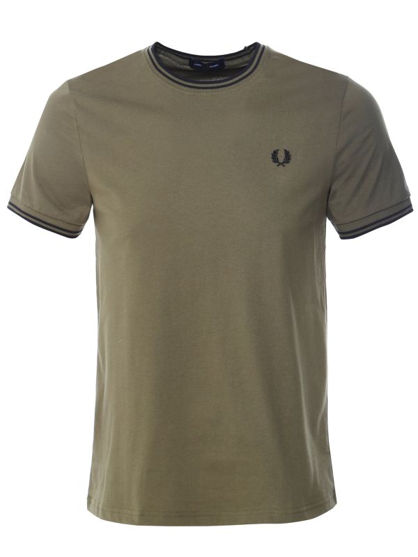 The Fred Perry twin tipped t shirt draws inspiration from classic sportswear. Engineered in pure cotton jersey, the simple tee offers a soft and lightweight handle. Featuring a crew neckline and short sleeves, the t shirt is available in a spectrum of colours choose from. This option is adorned in a uniform green hue with black details.