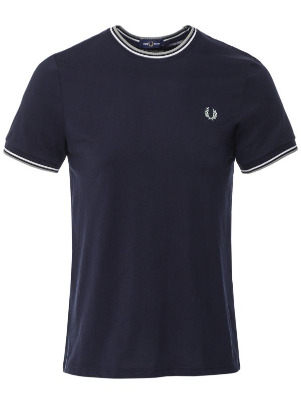 The Fred Perry twin tipped t-shirt is inspired by the label's signature polo shirts. Crafted in a soft cotton jersey, the navy tee features a ribbed crew neck and cuffs adorned with the brand's famous twin tipping, whilst the embroidered white Laurel Wreath to the chest adds an iconic finish.