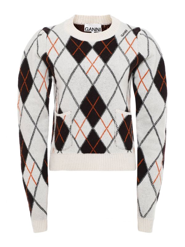 Upgrade your knitwear collection with the GANNI sweater. Beautifully crafted from certified recycled wool, this quirky sweater is a must-have to add to your wardrobe. Boasting mutton-style gathered sleeves and a cropped silhouette, the sweater is finished with two patch pockets to the front and an argyle print all over with contrasting details throughout.