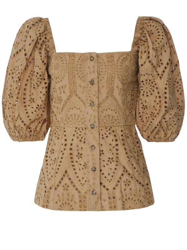 The Ganni broderie anglaise top is a stylish statement piece for your spring/summer wardrobe, delicately crafted in cotton with an elegant lace trim. This beautifully feminine blouse features a front button fastening, square neck and elasticated elbow-length bell sleeves - team yours with jeans and sneakers for a chic seasonal look.