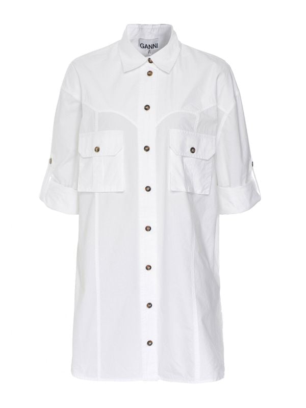 This Ganni button through shirt is a versatile piece for your everyday wardrobe, expertly crafted in cotton poplin for a crisp look. Featuring tortoiseshell buttons, chest pockets and a western yoke, this stylish shirt is an effortlessly cool style to team with your favourite jeans or mini skirt. The shirt is complete with a pointed collar, turn up sleeves and curved hem for a modern finish.