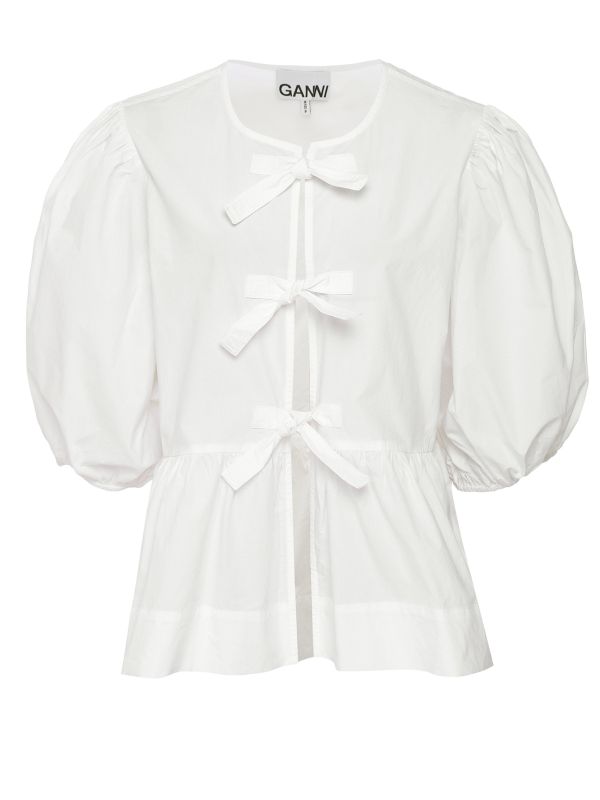 The GANNI poplin blouse is perfect for those smart-casual occasions. Lovingly crafted in certified organic cotton, the blouse has been created in a poplin fabric for a slightly stiffer handle. Featuring an open round neckline with front tie closure and stylish puff sleeves, with the peplum silhouette making for a statement shape.