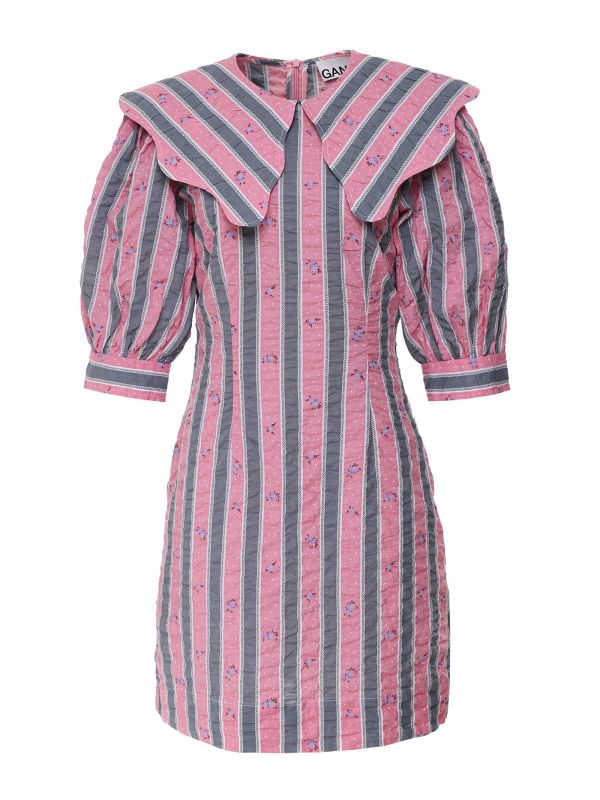 Get a stylish all-occasions look with the Ganni seersucker collar mini dress. Crafted from 100% organic cotton, this on-trend mini dress features a back zip closure, peter pan collar, elbow-length puff sleeves and an all-over stripe print. Wear through the day with your favourite sneakers or dress it up with heels on an evening.