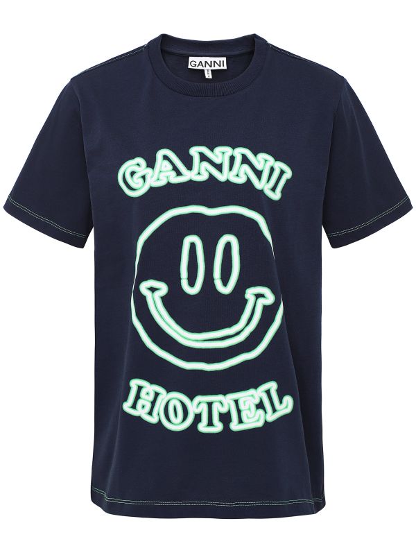 Complete your laid-back looks in style with the GANNI Hotel t-shirt. This cool, casual tee is made from 100% organic cotton and features a classic crew neck, short sleeves, contrast seam details and this season's GANNI hotel logo graphic.