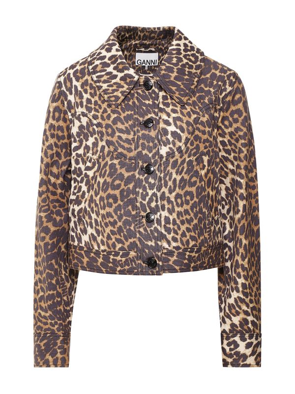The Ganni canvas jacket delivers signature style synonymous with the Danish label. Crafted in a hemp and organic cotton canvas, the short jacket provides a durable yet soft handle. Featuring a statement collar with button closure, side welt pockets and unique panel construction, whilst the leopard print makes for statement impact.