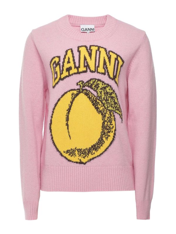 This GANNI graphic jumper is a must-have piece for your transitional wardrobe. Made from a luxe mix of wool and recycled polyamide, this effortless knit features an O-neckline, long sleeves, ribbed trims and a statement GANNI logo and peach graphic to the front.