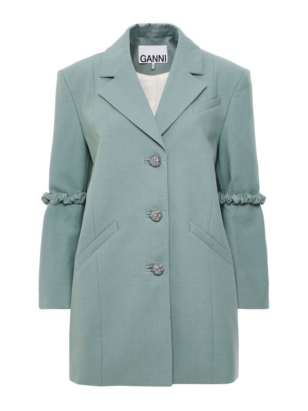 Look no further than the GANNI blazer for the perfect SS22 jacket. Beautifully crafted in Portugal from pure organic cotton, the GANNI blazer takes a feminine twist on a menswear-inspired garment. Featuring padded shoulders, quirky metal buttons and an oversized silhouette, the blazer is complete with unique scrunchie details to each elbow. Complement yours with the matching GANNI suit shorts for the ultimate chic outfit.