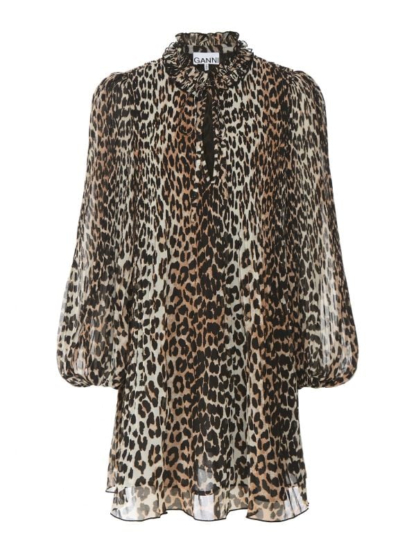 Elevate your transitional wardrobe with the Ganni georgette mini dress. Finely pleated throughout, this elegant dress has been cut to a mini length and designed for a relaxed, A-line silhouette. Featuring a keyhole neckline, tie fastening and ruffled collar, the dress is a chic statement option to effortlessly take you from day to night. Sheer sleeves with puff shoulders and elasticated cuffs complete the look.