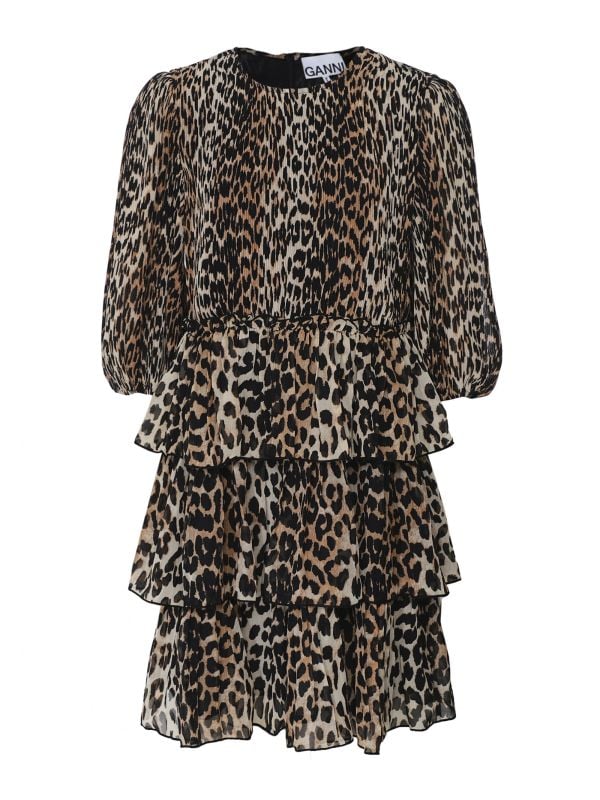 Get a chic feminine look this season with the Ganni georgette mini dress. Crafted in recycled polyester, this beautiful trapeze mini dress features all-over pleats, ruffle details, elbow-length elasticated balloon sleeves and a tiered skirt, while an all-over leopard print provides an on-trend finishing touch. Team yours with sneakers and a stylish Ganni headband.