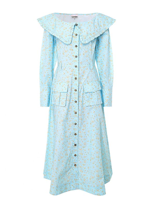 The Ganni printed cotton poplin dress is a shirt-style button-up midi dress with a flattering form-fitting waist and slim flared skirt. This transitional dress features a boat-neck version of Ganni's signature ruffled peter-pan collar, long balloon sleeves with buttoned cuffs, front flap pockets and a ditsy floral print throughout. Add a belt and your favourite sneakers for an effortless everyday look.