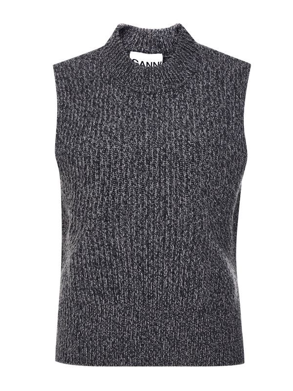The GANNI rib-knit vest is an everyday essential with an effortlessly stylish look. Responsibly crafted using recycled materials, this soft wool sweater is easy to style with tailored pants, jeans and skirts. It features a classic crew neck and side slits.