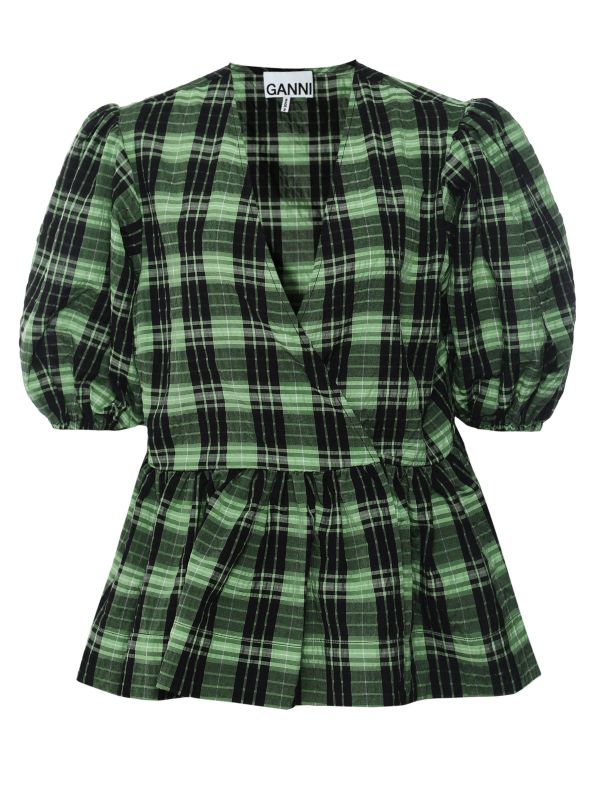 The GANNI seersucker check wrap blouse is a stylish staple piece made from a blend of certified organic cotton. This versatile top features a V-neck, short puff sleeves with elasticated cuffs and a wrap silhouette. It's complete with a classic check pattern and looks great paired with skirts, pants and denim alike.