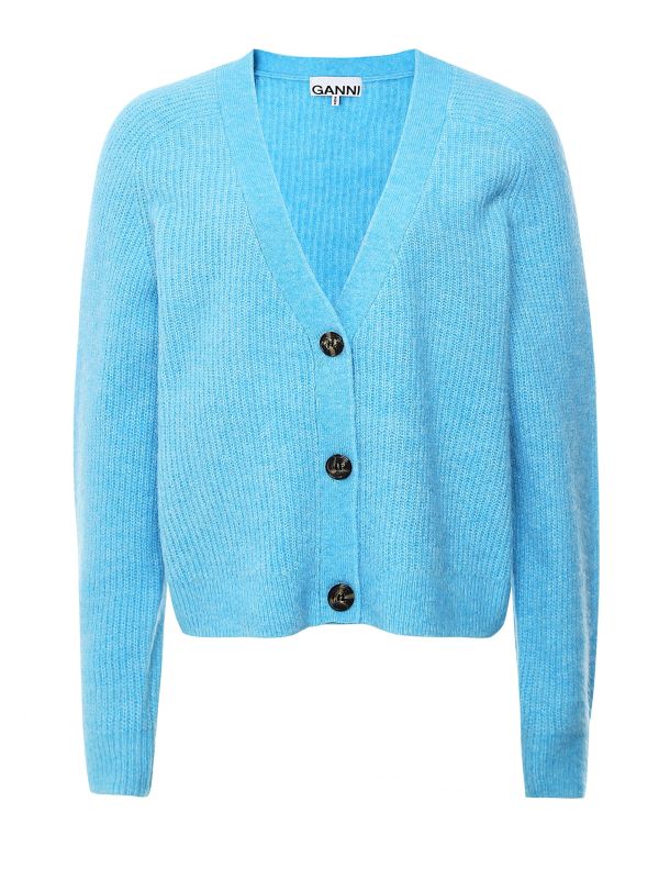 Get an effortless everyday look with the Ganni wool knit cardigan. This beautifully soft piece of knitwear is crafted in a sumptuous alpaca and merino blend and makes the perfect off-duty layer. This stylish rib-knit cardigan features a three button fastening, cropped silhouette and boxy fit and is perfect for teaming with your favourite jeans.