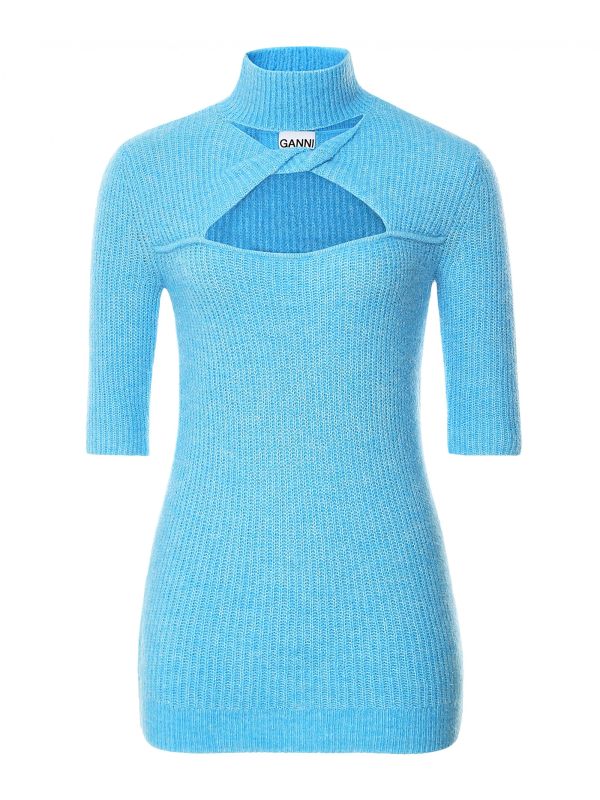 The Ganni soft wool knit top is a lightweight knit, crafted in a sumptuously soft wool-alpaca blend. This versatile knit has a flattering form-fitting silhouette and features a mock turtleneck, twisted keyhole detail and elbow-length sleeves.Style with everything from your go-to jeans to shorts or skirts.