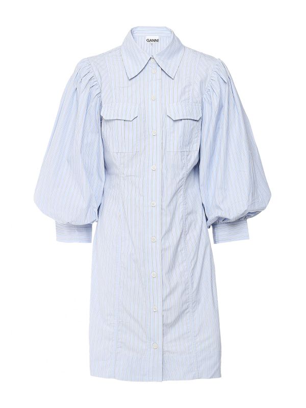 Get a stylish, transitional look this season with the Ganni stripe mini dress. Crafted in striped organic cotton, this chic summer dress has a flattering form-fitting body with a pointed collar and puffy balloon sleeves. The dress has a button down fastening and chest pockets with flaps, while accent stitching, exaggerating wide hems and princess seam details complete the look. Wear with your go-to sandals or sneakers for a cool everyday ensemble.