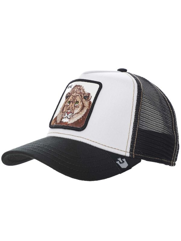The Goorin Bros The King Lion cap is a stylish trucker cap that features a fabric front and a mesh back, ensuring both durability and breathability. The cap is adorned with a distinctive embroidered Lion badge on the front, adding a touch of regal flair.