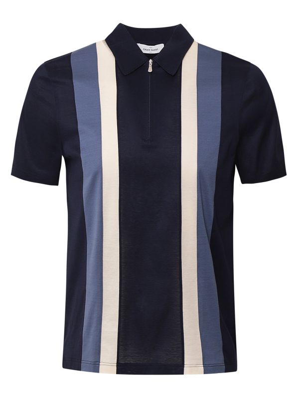 The Gran Sasso striped zip polo draws inspiration from retro sportswear. Expertly crafted in Italy using pure organic cotton, the polo shirt ensures comfort and breathability. Featuring a fine rib collar with zip placket, whilst the wide striped design lends bold impact.