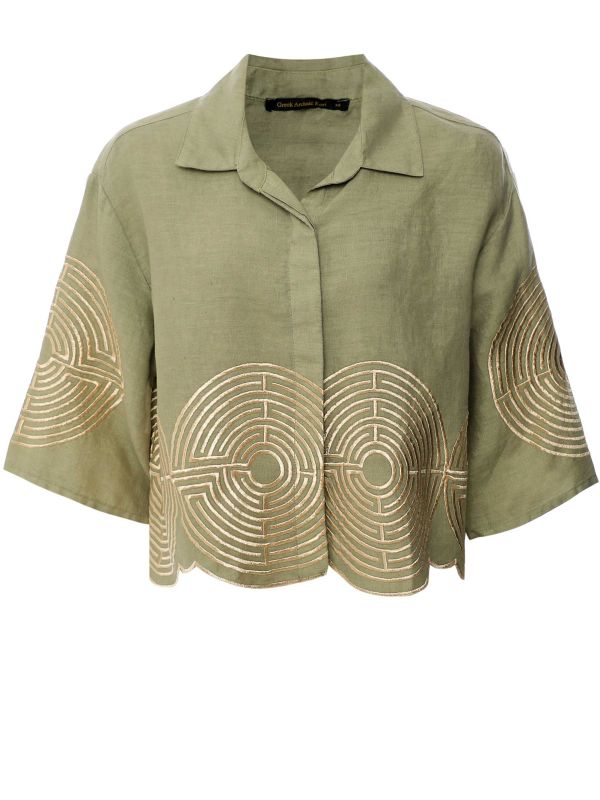 The Circle Cropped Linen Shirt from luxe resortwear brand Greek Archaic Kori is a simple linen shirt elevated by gorgeous details. Cut to a cropped length and crafted from pure linen, this shirt has a classic pointed collar, button closure and 3/4 length wide sleeves. The standout details are the pretty scalloped hem and dazzling golden embroidery in geometric circles across the front, back and sleeves.