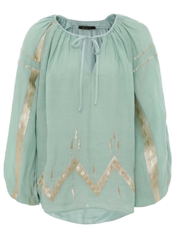 Greek Archaic Kori's Embroidered Blouse is the ultimate summer staple. This Greek Archaic Kori blouse is made from a breezy ramie-blend and features a V neckline with ties, long sleeves with elasticated endings and a curved hem. It's designed for a loose fit and is adorned with golden embroidered zig-zag patterns to finish.