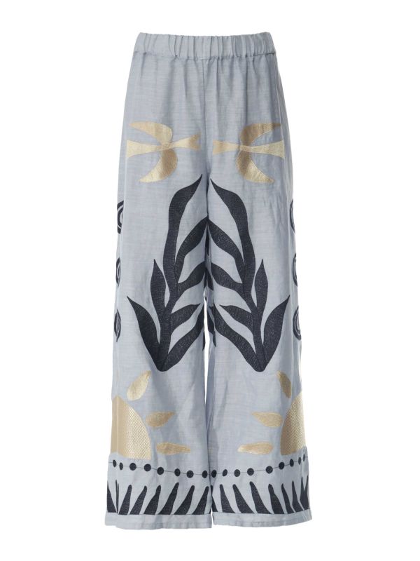 Enjoy effortless style in the Embroidered Linen Pants from Greek Archaic Kori. Made from linen, these pants have a wide leg and a comfortable elasticated waistband for slipping on with ease. Embroidered patterns cover the legs and add a vacation feel, particularly with the golden suns. Pair these statement pants with your favourite sandals and a simple vest.