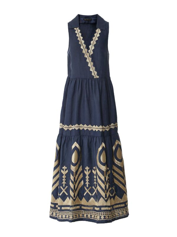 The Greek Archaic Kori Feather Sleeveless Midi Dress is a seasonal staple. Crafted from 100% linen, it offers maximum comfort while the gold embroidery adds texture and shine. This sleeveless midi-length dress has a flat collar, V neckline and a tiered skirt. The embroidery creates feather patterns for a distinctive dress that can be worn effortlessly in the new season.