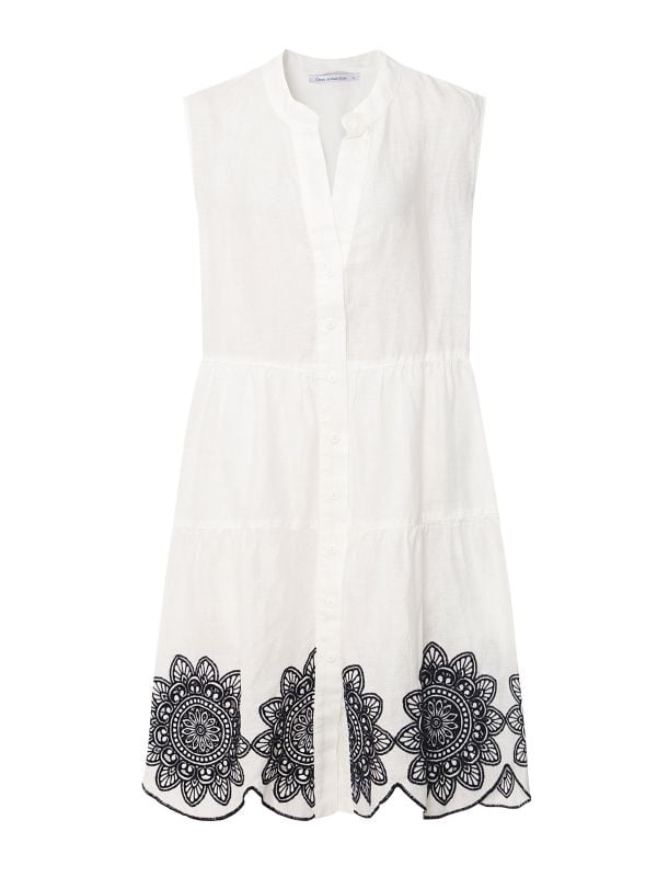 The Greek Archaic Kori sleeveless daisy dress is a chic summer staple for your everyday wardrobe. Made from linen for a lightweight and breathable feel, this beautiful dress features a stand collar, button-down front and a tiered mini skirt complete with a scalloped hem and embroidered daisies. This Kori dress looks great teamed with sandals and sunglasses for a beach-ready look.