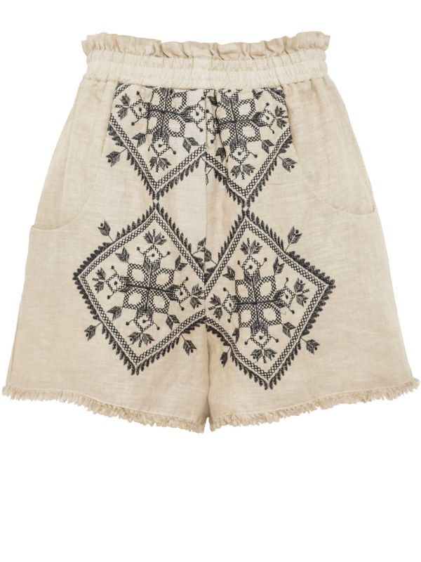 The loose fit is complemented by curved side pockets and delicate embroidered detailing that adds an artisanal touch. Finished with raw hems for an effortless, lived-in edge, these Greek Archaic Kori shorts bring a sense of laid-back elegance to your warm-weather wardrobe—ideal for pairing with light tanks or breezy blouses.