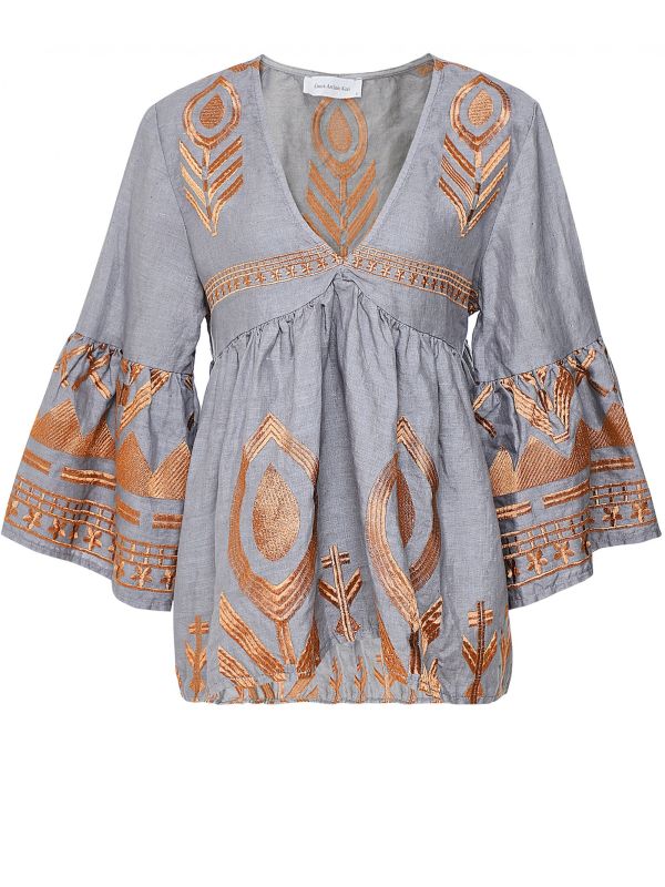 Update your summer wardrobe with the Kori; embroidered blouse. Made from luxurious linen for a lightweight and breathable feel, this essential top looks great teamed with your favourite jeans or shorts. It features a flattering V-neck, 3/4 bell sleeves and all-over metallic embroidery, with gathered detailing under the bustline and back for a chic finish.