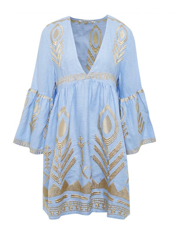 Add a chic summer staple to your everyday wardrobe with the Kori embroidered dress. This beautiful mini dress is made from linen for a lightweight and breathable feel and features a flattering V-neck, 3/4 bell sleeves and metallic embroidery throughout for a glamorous finish. This Kori dress looks great teamed with sandals and sunglasses for a stylish beachy look.