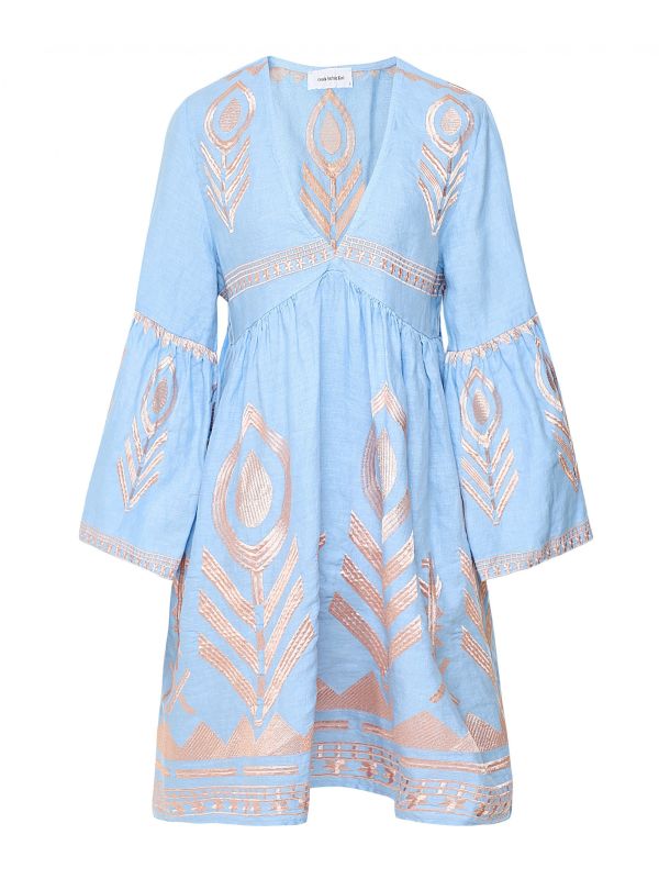 Add a chic summer staple to your everyday wardrobe with the Kori embroidered dress. This beautiful mini dress is made from linen for a lightweight and breathable feel and features a flattering V-neck, 3/4 bell sleeves and metallic embroidery throughout for a glamorous finish. This Kori dress looks great teamed with sandals and sunglasses for a stylish beach-ready look.